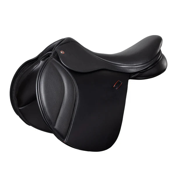 The THOROWGOOD | T9 Jump is a dedicated showjumping saddle designed to perform in any competition arena, regardless of your experience level. It’s equally suited for schooling, hacking, or tackling cross-country fences. Its tree and points enhance support at the front of the panel while promoting freer shoulder movement. Crafted with supple leather on all key contact areas—seat, skirt, and knee pads—the forward-cut flap accommodates a jumping leg position. The secure seat features a low cantle for unrestricted jumping posture and improved weight distribution over fences. Adjustable Velcro knee blocks allow precise leg support, and the SimaTree R-Bar system offers fit adaptability for both high and standard withers. Made in England.
