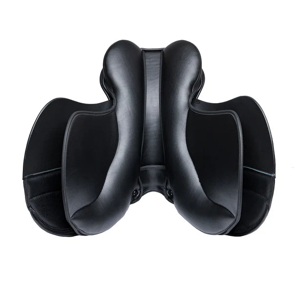 This leather hybrid saddle is crafted for children and pony riders who enjoy a variety of disciplines, with a focus on jumping. Its sleek design is suitable for competition, featuring forward-cut flaps that support a shorter jumping leg position. The seat, skirt, and knee pads are made from soft leather for comfort. A secure seat with a lower cantle allows balanced positioning over fences. The adjustable Velcro knee block offers customizable leg support. Flocked with 100% British wool, it comes in a standard panel profile and includes the SimaTree S-Bar for fitting low or standard withers. Multiple girthing options, including a point strap, enhance stability. Made in England.