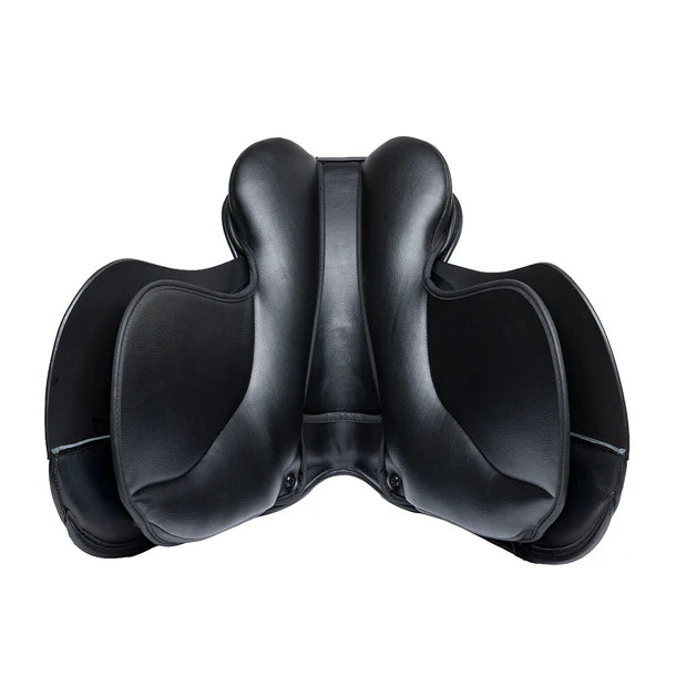 Designed specifically for leggy teenagers needing a smaller seat but a forward-cut flap to fit longer legs, the THOROWGOOD T9 Pony Long Leg also suits petite adults riding ponies or short-backed horses. Crafted with supple leather on all contact areas—seat, skirt, and knee pads—this saddle features a forward flap ideal for jumping and cross-country. It includes an adjustable Velcro knee block for tailored leg support and panels flocked with 100% British wool for optimal comfort and weight distribution. The panel shape suits short-backed ponies, and with the SimaTree S-Bar system, it can be adjusted for both low and standard wither shapes. Made in England.